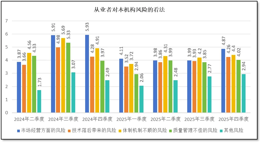 由上面两图可见,四季度以来,从业者们认为本机构所面临的各方面风险均有一定程度增加,其中,认为“市场经营”方面的风险增长最为明显,分值为4.87分,较3季度增长了0.88分,这也是2025年以来的最高值。这与前面从业者们对本机构发展信心有所下降形成呼应,说明尽管行业整体向好,但由于市场环境日趋复杂,对检验检测机构管理层正确决策的要求越来越高,稍有不慎可能就会导致机构运行出现问题,因此从业者们的信心才会动摇和下降,认为市场经营方面的风险有所增大。