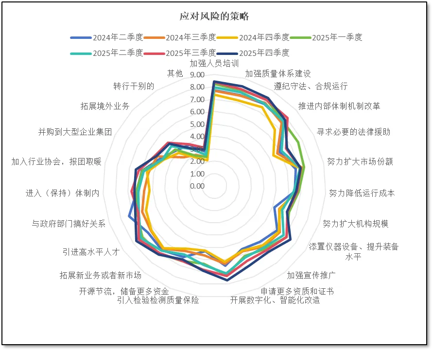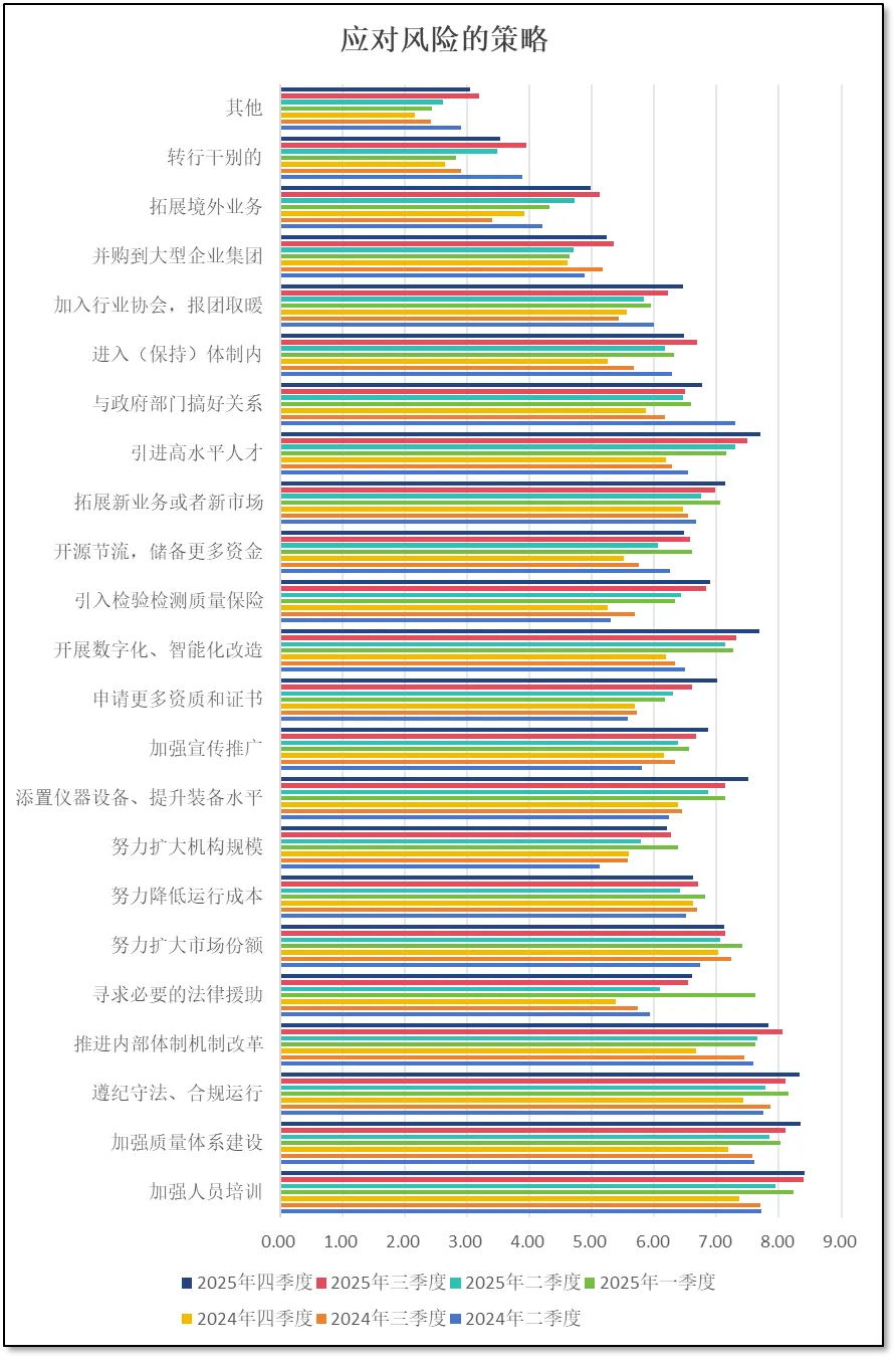 四季度,检验检测从业者信心呈现“整体乐观、局部谨慎”特征:对当年行业发展信心为8.38分(7季度新高)、未来5年信心8.53分(历史最高),反映宏观向好与行业高质量发展(机构数量减少、劳动生产率提升)的积极预期;但本地区、本行业、本机构信心略有回落,体现从业者对局部市场风险的洞察。个人发展前景8.02分、收入满意度7.03分(新高),与行业信心联动提升。营商环境评分7.45分(环比降0.08),竞争公平性降至7.12分,年底不规范竞争与监管突击检查是主因。机构能力方面,质量管理稳中有升(8.02分→8.07分),但技术、市场、数字化能力略有回落,数字化智能化滞后成为突出担忧点。风险层面,市场经营风险4.87分(环比增0.88,全年最高),其他风险亦有所上升;应对措施中,加强人员培训(8.41分)、质量体系建设(8.35分)、合规运行(8.33分)为核心共识,数字化改造等措施也获从业者关注。