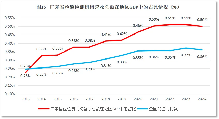 再来看广东省检验检测机构营收总额在其地区生产总值GDP中的占比情况。2024年度,广东省检验检测机构营收总额708.97亿元,占当年广东省GDP值的0.50%,远高于全国平均值0.36%,排名全国第4(按照由高到低排序)。过去12年广东省检验检测机构营收总额在当地GDP值的比例变化情况如图15所示。