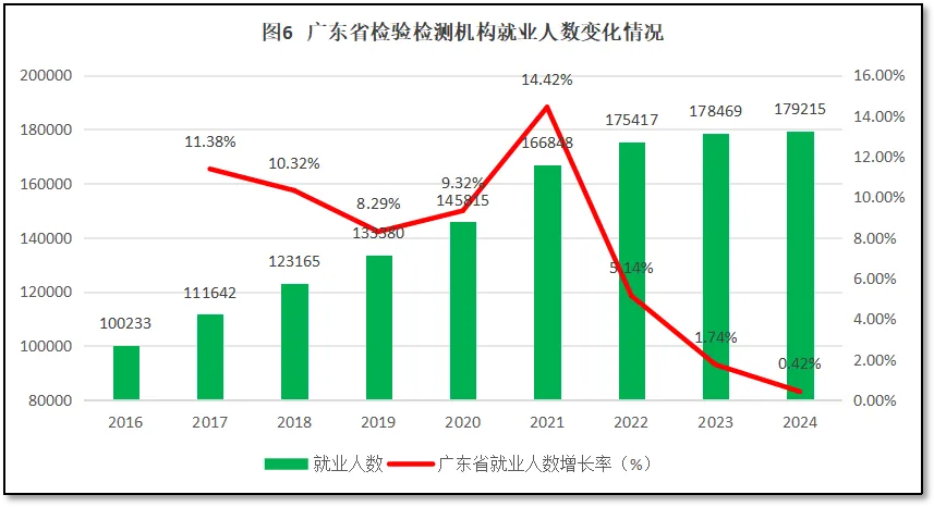 由图6可见,从2016年到2024年,广东省检验检测机就业人口数量从10万人左右增长到17.9万人,年均增速7.63%。就业人口同比增长率在2021年度达到最高峰,为14.42%,之后开始下降,2024年度增长率仅有0.42%,是历年的最低值。