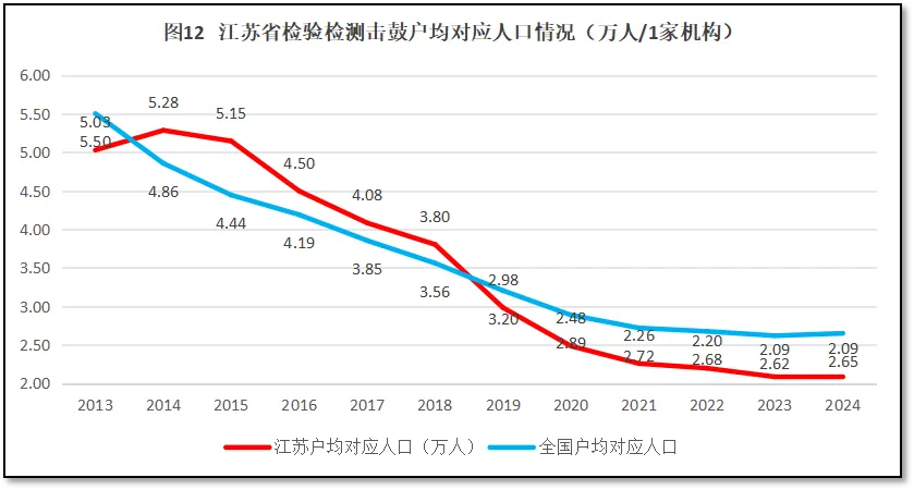 再来看江苏地区检验检测机构户均对应服务的人口数据。2024年末,江苏省常住人口8526万人(与2023年基本持平),检验检测机构户均服务人口2.09万人,低于全国平均数2.65万人。过去12年,江苏省检验检测机构户均对应的人口数量与全国的情况进行比较,如图12所示。