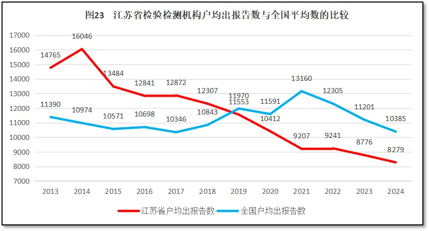 2024年度,江苏省检验检测机构户均出具检验检测报告8279份,是全国平均水平10385份的79.7%,全国排名继续保持在第13位,处于中游水平。从2013年以来,江苏省检验检测机构户均出具检验检测报告数量与全国的比较如图23所示。